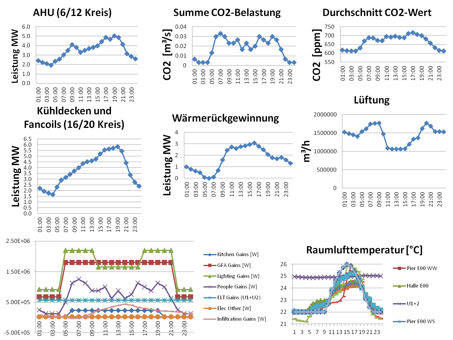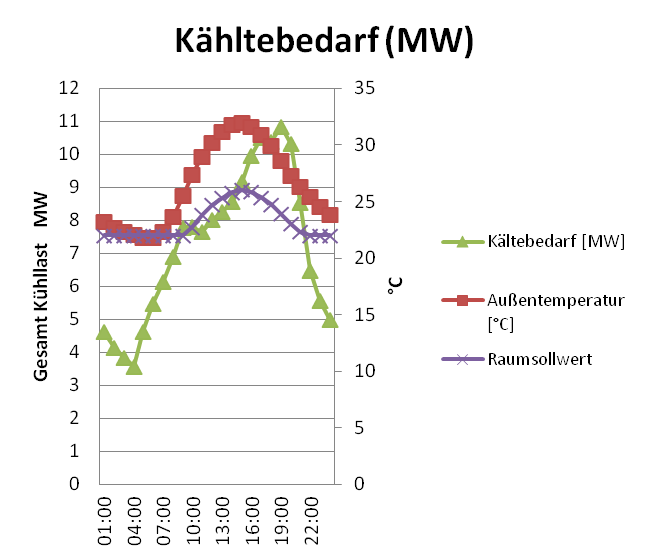 Gegenstand der Simulation ist die Ermittlung des Gesamtkälteanschlusswertes für die Fernkälteversorgung des Fluggastterminals des Flughafens Berlin Schönefeld gewesen. Die zeitabhängige Kühllast, bzw. der Anschlusswert wurde anhand der Kühllast Berechnung additiv ermittelt, unter Berücksichtigung des Tagesganges der Sonneneinstrahlung, der Verschattung der Gebäude untereinander, der tageszeitabhängigen Perzonenzahlen anhand des Flugplanes der FBS sowie der Beleuchtung, welche ebenfalls tageszeitabhängig geschaltet wird, optimiert bzw. reduziert. Diese Maßname dient auch der Optimierung zur Auslegung der Fernkälteversorgung.